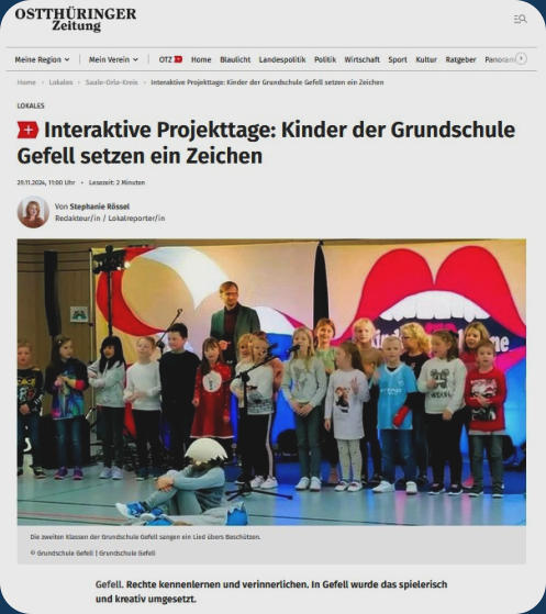 Kinderrechte im Rampenlicht – Eine Show  voller Fantasie und Botschaften  In der Sporthalle der Grundschule Gefell im Saale-Orla-Kreis in Thüringen ging es zwei Tag lang höchst lebendig, originell und bedeutsam zu: Unter der Überschrift »Barfuß über Wiesen – Projekttage« setzen Grundschulkinder gemeinsam mit den Profikünstlern der »KINDERLIEDBÜHNE« Mecklenburg-Vorpommern aus Greifswald ein klares Zeichen für die Rechte der Kinder. In den Wochen zuvor hatten Kinder aller Klassenstufen mit viel Herzblut und Fantasie an eigenen Programmpunkten gearbeitet. Endlich war es soweit: Ihre Beiträge wurden in einer mitreißenden Show auf die Bühne gebracht. Unterstützt von ihrer Schulsozialarbeiterin waren dabei beeindruckende Darbietungen entstanden, die zeigten, wie wichtig Themen wie Gleichheit, Bildung, Mitbestimmung und Schutz vor Gewalt für uns alle sind. Die Projekttage endeten mit einer abwechslungsreichen Mischung aus Theater, Musik und Tanz, die nicht nur unterhielt, sondern auch zum Nachdenken anregte. Denn auch hierzulande gibt es Kinder, die nicht die gleichen Chancen auf ein selbstbestimmtes Leben haben. Genau da setzt das Projekt an: Es will Aufmerksamkeit schaffen und die junge Generation selbst zu Wort kommen lassen. »Unsere Kinder sind keine bloßen Zuschauer – sie gestalten aktiv mit. Dieses Projekt zeigt, wie viel Potenzial und wie viele Ideen in ihnen stecken«, sagte Andrea Peters von der »KINDERLIEDBÜHNE« Mecklenburg-Vorpommern. Gemeinsam mit ihrem Bühnenpartner Thomas Birkigt setzen sich beide seit vielen Jahren für die Kinderrechte in Deutschland ein. Die »Barfuß über Wiesen – Projekttage« versprechen viele unvergessliche Begegnungen und Momente voller Kreativität, Begeisterung und vor allem wichtiger Botschaften. Sie zeigen: Kinder haben eine Stimme – und die war in Gefell besonders kraftvoll!